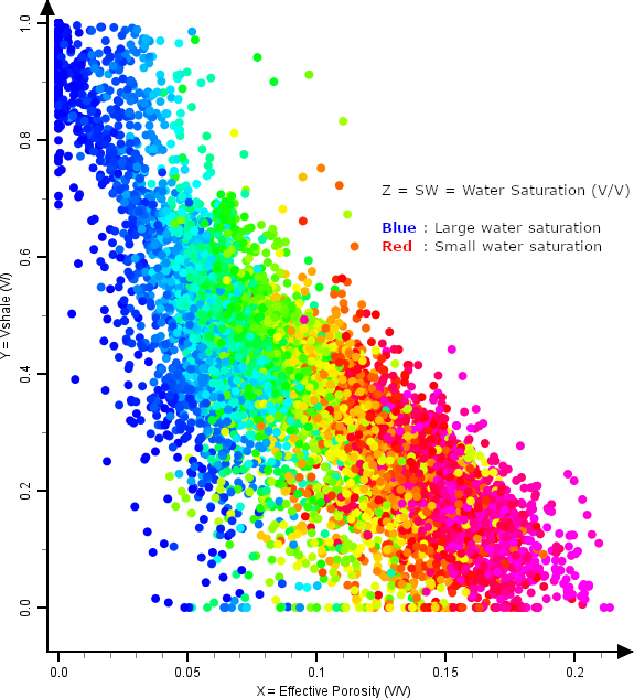 3D color palette cross-plots of x=Effective Porosity, y=Vshale, and Z=Water Saturation or Bulk Volume of Water