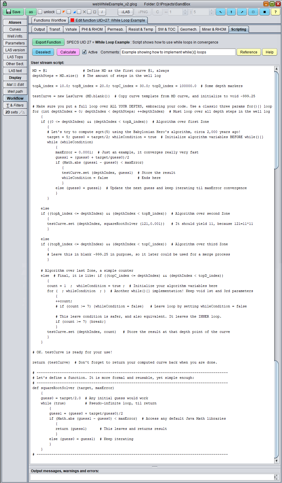 GeolOil GLS Petrophysics script example showing how to use while(){} loops