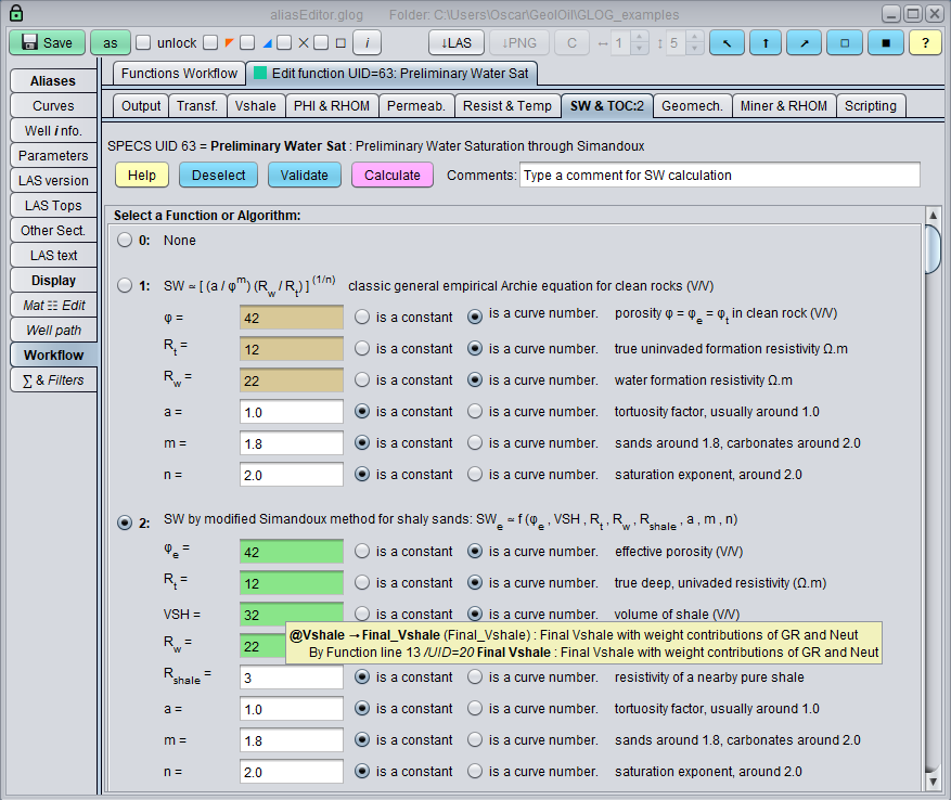 GeolOil choses the correct curve numbers for the modified Simandoux equation based on its aliases